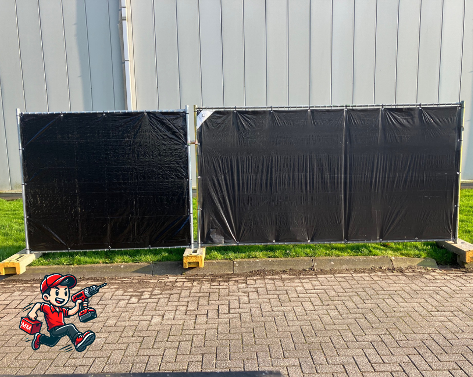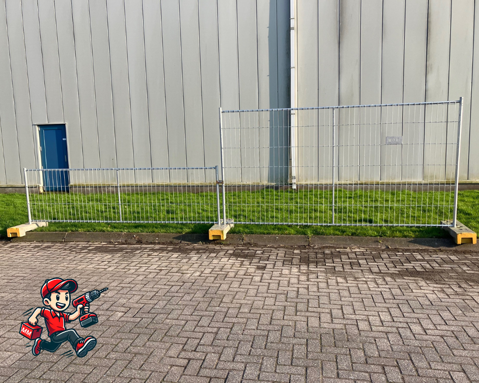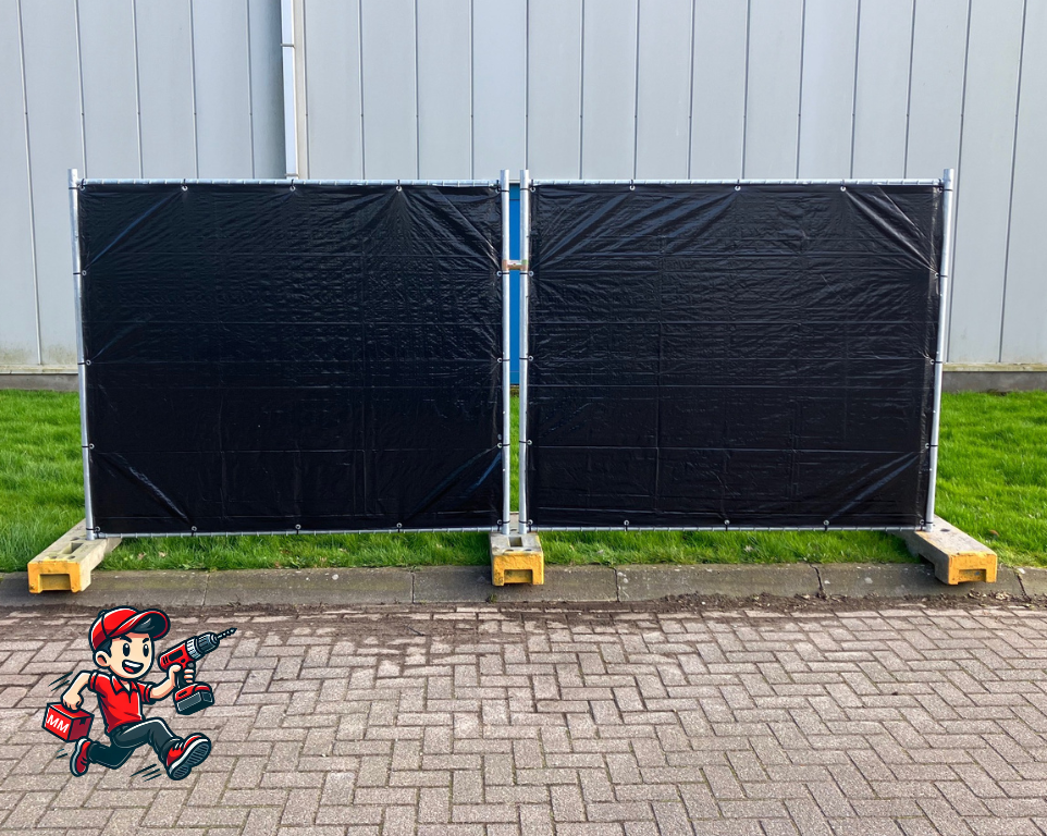 De afmetingen van het bouwhek zijn (bxh) 350 x 200 cm en worden geleverd met blokken en klemmen.