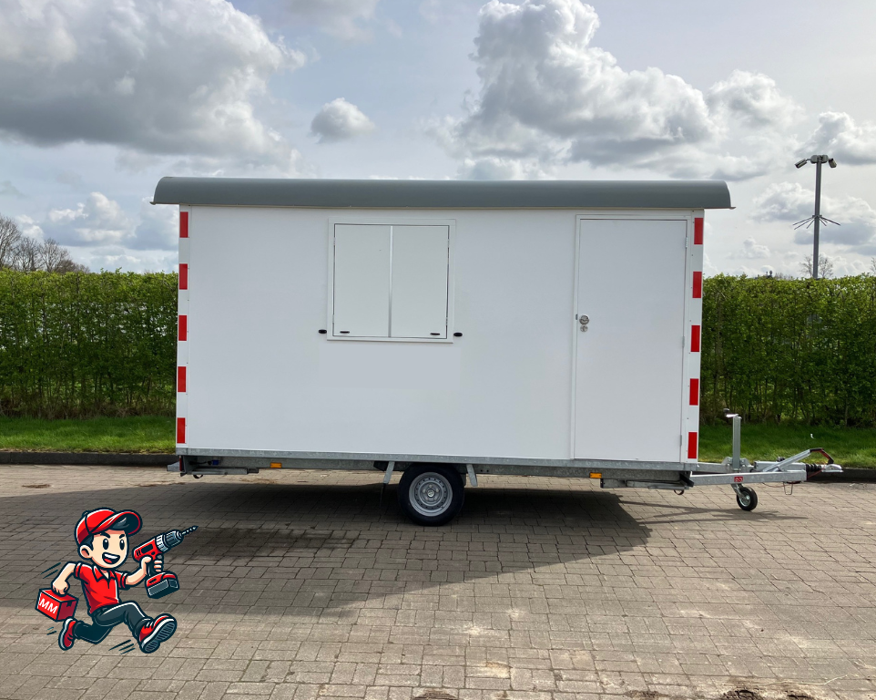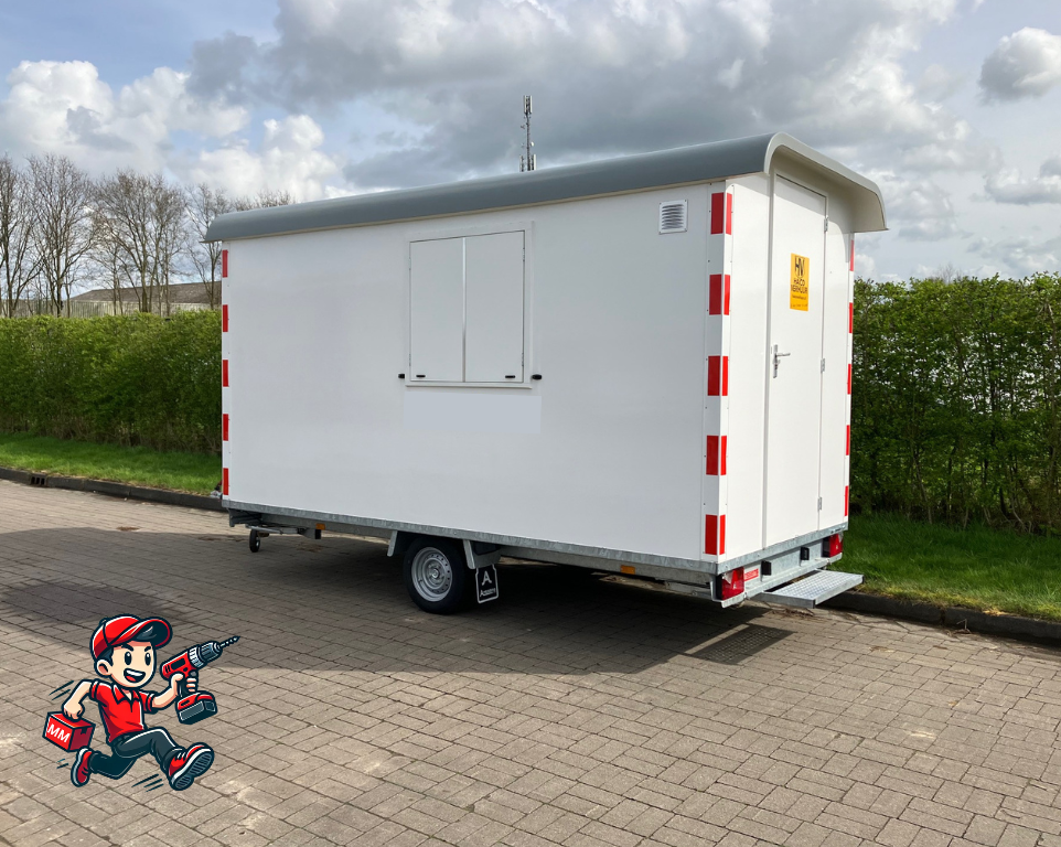 Materieelmaatje brengt en haalt deze schaftwagen bij u op locatie en kan uitgebreid worden met een chemische toilet.